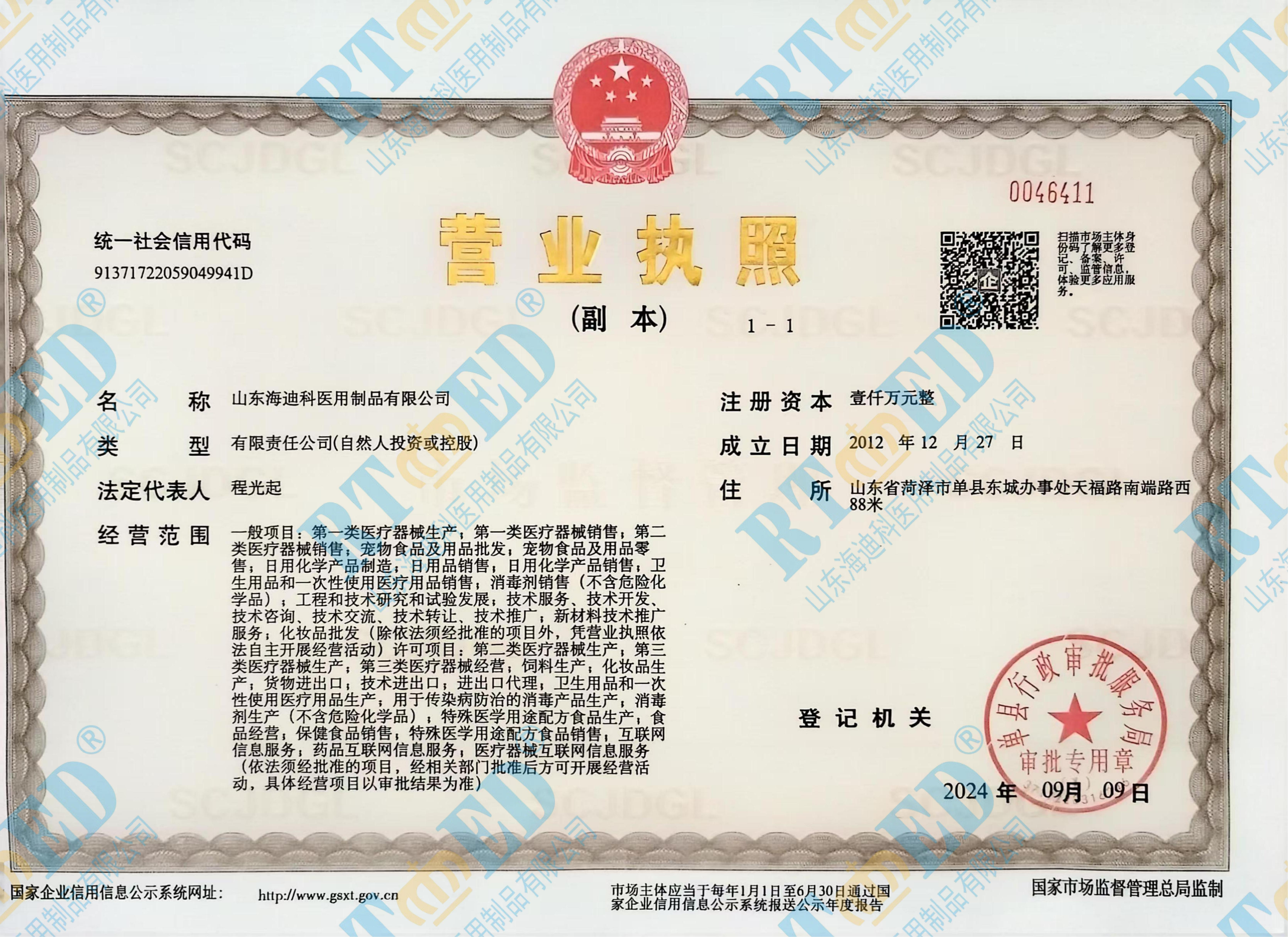 海迪科醫(yī)療器械生產(chǎn)許可證